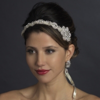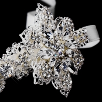 Side accent headpiece encrusted with dozens of sparkling rhinestones and crystals. An ornate piece designed with attention to intricate detail, all strung along an ivory ribbon.