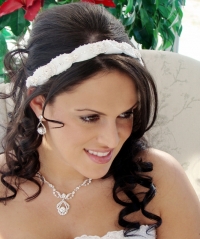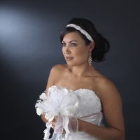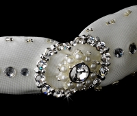 This lovely white satin bridal headband is woven through a silver plated buckle detail band and features a stunning silver plated bow with rhinestone and swarovski accents. The ornament is set to the side on a bed of feathers. The ornamented portion of the band measures 9-1/2" wide and 3/4" tall, and the side ornament measures 4-1/2" wide and 4-1/2" tall. The piece is fastened with two 35" satin ribbons that tie beneath your hair. A chain of rhinestones and swarovski crystals dangle 3" from one side of the headband. Size: 9-1/2" wide and 3/4" tall